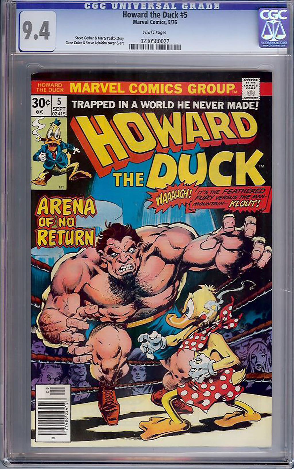 CGC 9.4 graded copy of Howard the Duck #5, published by Marvel Comics in September 1976. Written by Steve Gerber with cover and interior art by Gene Colan and Steve Leialoha, this Bronze Age classic features the satirical cult-favorite Howard in the unforgettable “Arena of No Return” storyline.